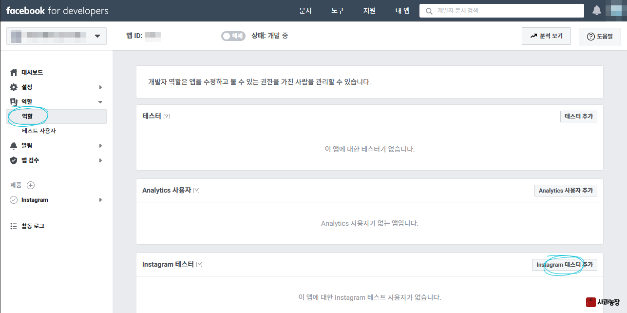 OAuth 리디렉션 URI를 잘 입력하고 저장이 잘 됐으면 왼쪽 메뉴에서 역할 > 역할로 이동해서 Instagram 테스터 추가 버튼을 누른다. (Instagram 테스터 위에 있는 그냥 테스터 아님)