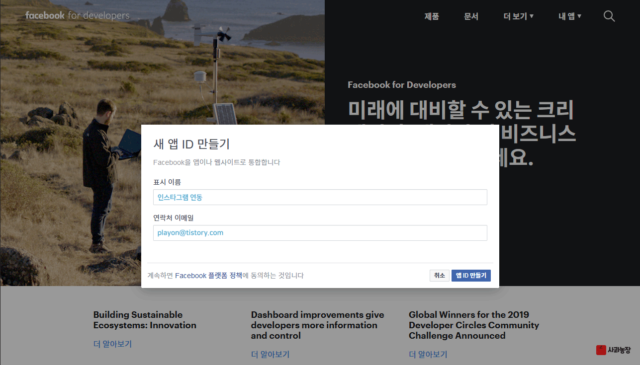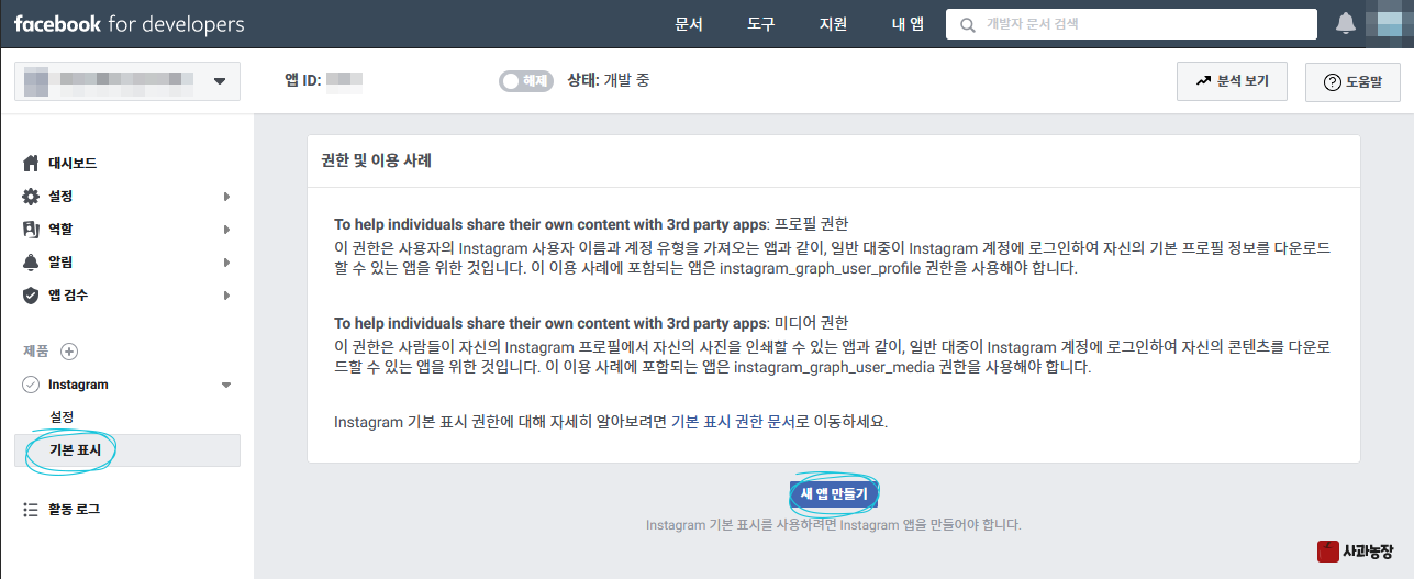 새 앱을 만든다. 이거슨 인스타그램 앱이 아니고 페이스북 앱이다. 페이스북 앱을 먼저 만들고 그 안에서 인스타그램 앱을 만들어야 한다.