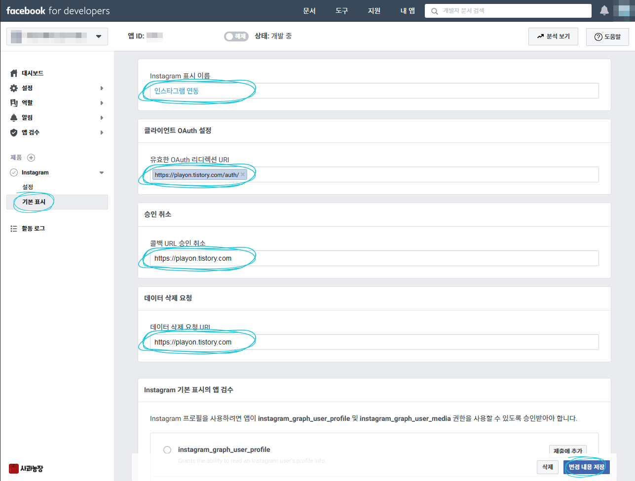 하단에 "Instagram 기본 표시의 앱 검수" 안해도 됨