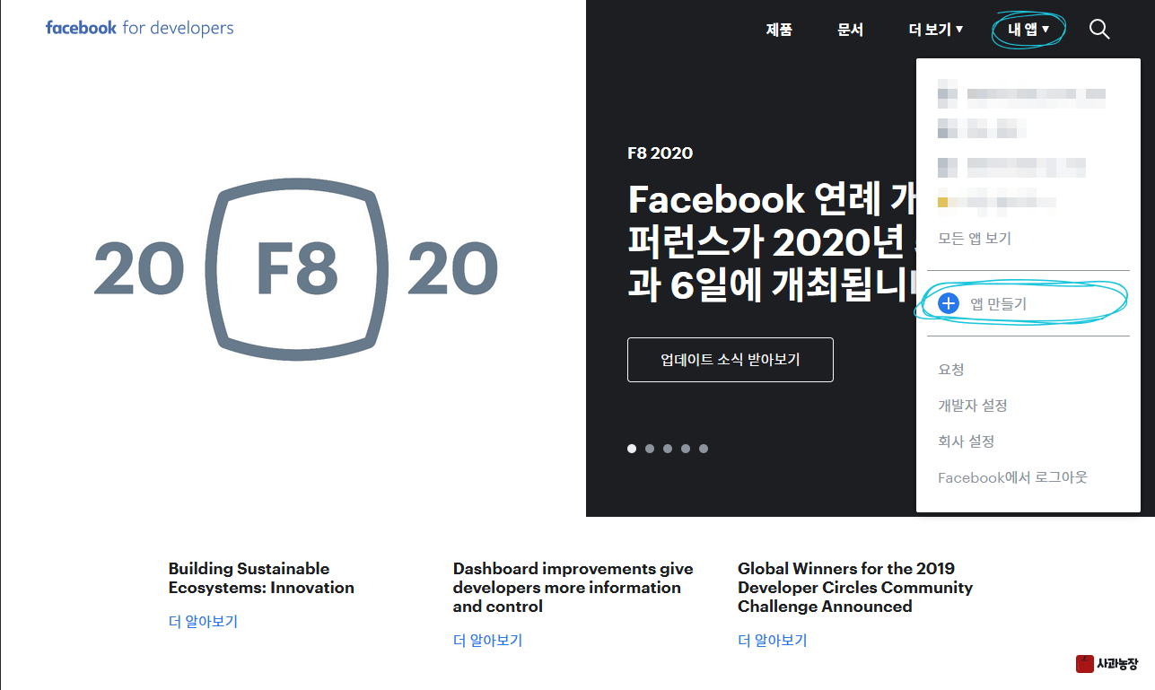 페이스북 개발자 페이지(위에 주소)로 가서 로그인 후 내 앱 > 앱 만들기를 클릭