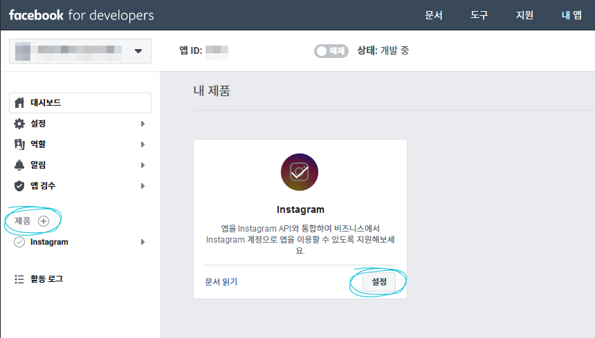 앱 생성 후 방금 만든 앱의 설정에 들어온다.
