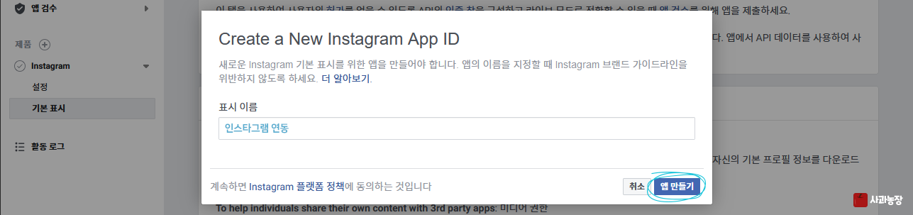 인스타그램 연동 준비물