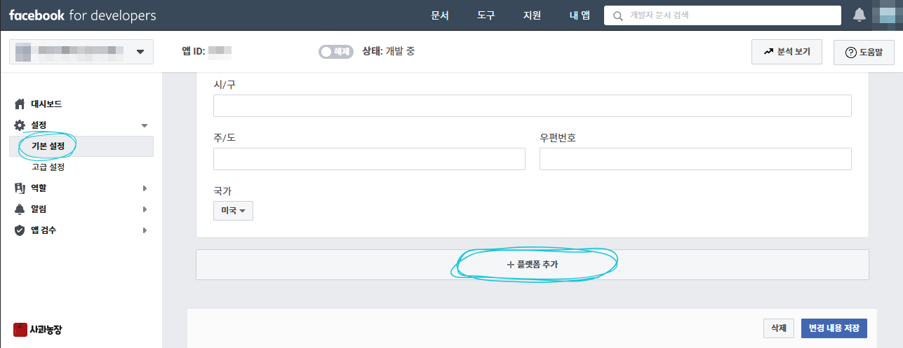 위에서 앱 만들기 버튼을 누르면 기본정보(?)를 입력해야 하는데,