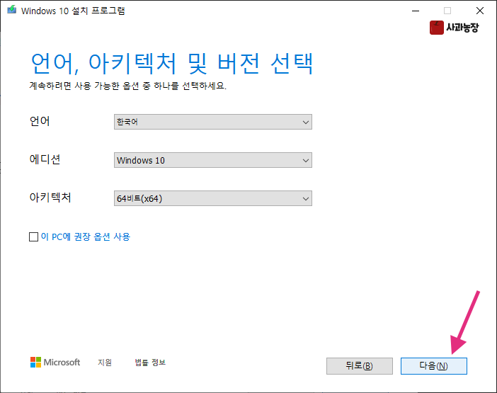 처음에는 "이 PC에 권장 옵션 사용"이 체크되어 있는데, 체크를 풀고 필요한 항목으로 선택해 줍니다.