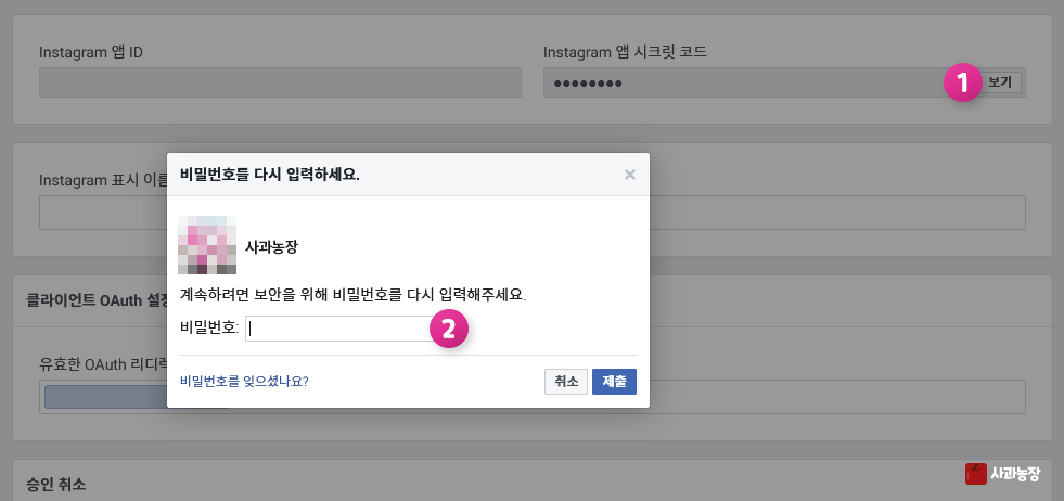 Instagram 제품 > 기본표시 페이지에 가서 ①Instagram 앱 시크릿 코드 보기를 눌러 ②비밀번호를 입력하면 시크릿 코드가 별표에서 텍스트로 바뀌게 됩니다. (비밀번호는 페이스북 비밀번호에요.)