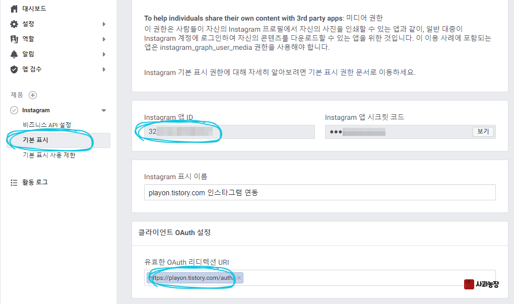 - client_id : Instagram 제품 > 기본표시에 숫자로 된 Instagram 앱 ID
