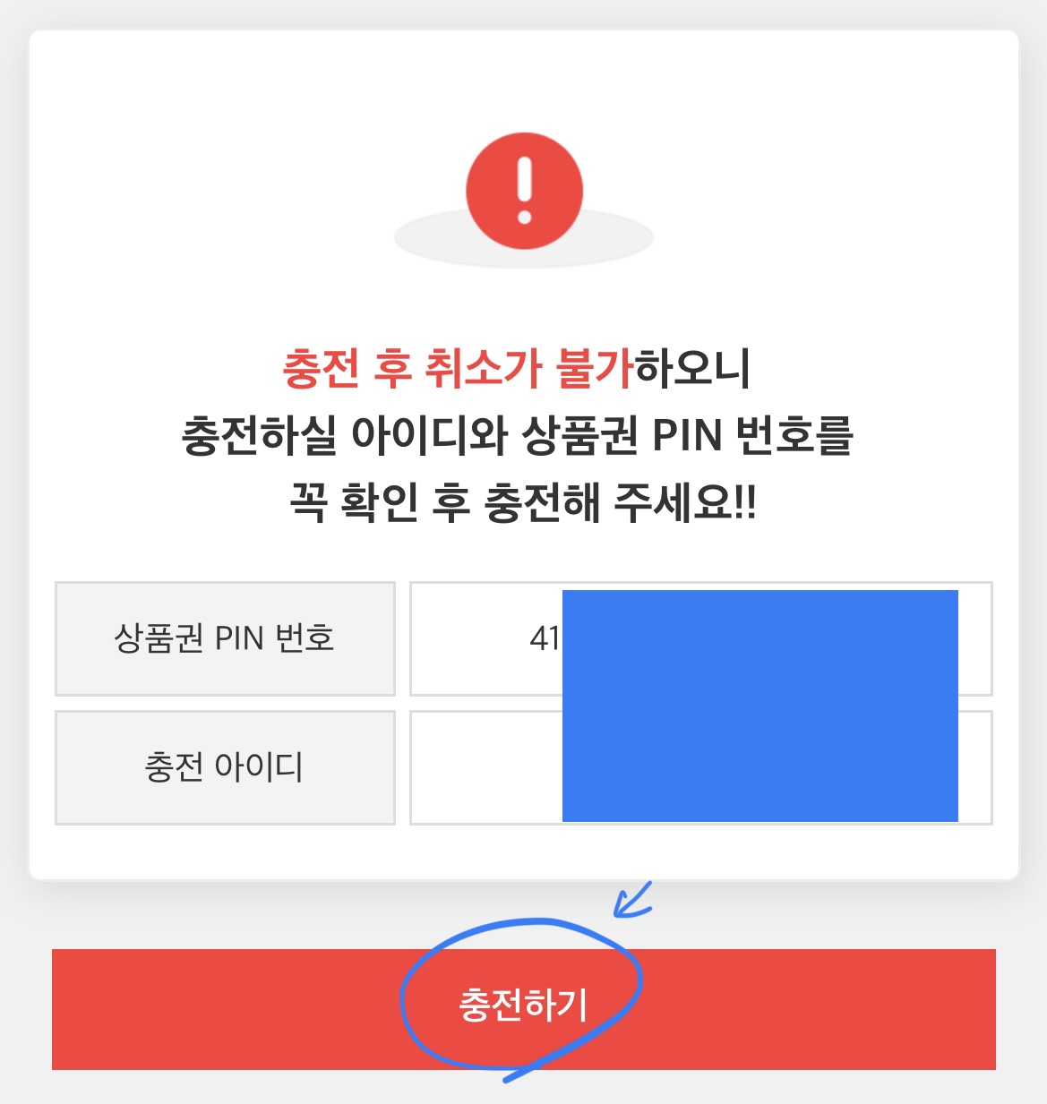 상품권 PIN번호와 충전 아이디를 확인하고 충전하기를 누르면~~~