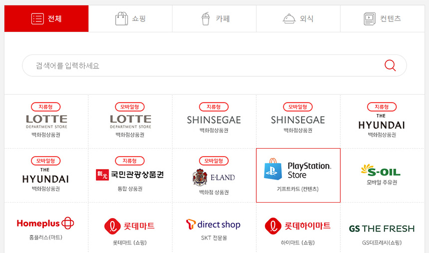 메인 메뉴에서 쿠폰 메뉴로 이동하면 PS스토어 기프트카드가 보입니다. 여기를 클릭!!