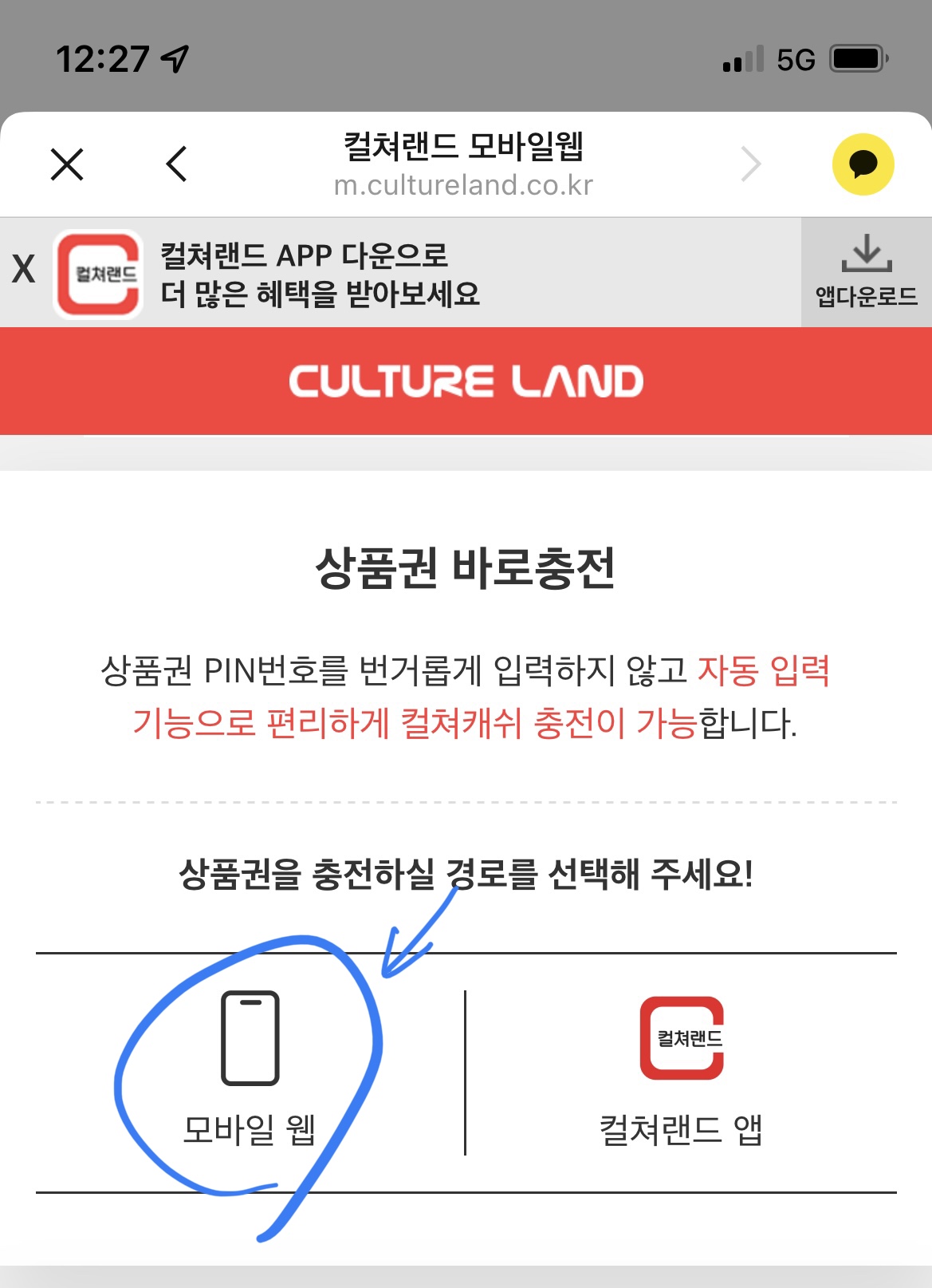 컬쳐랜드 앱은 없으니 모바일 웹으로 충전을 합니다.
