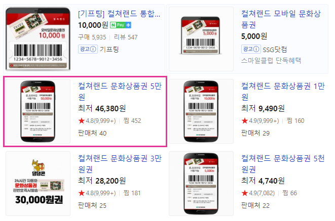 네이버에서 컬쳐랜드 문화상품권이라고 검색하면 이런 식으로 쇼핑 카테고리에서 찾을 수 있습니다.